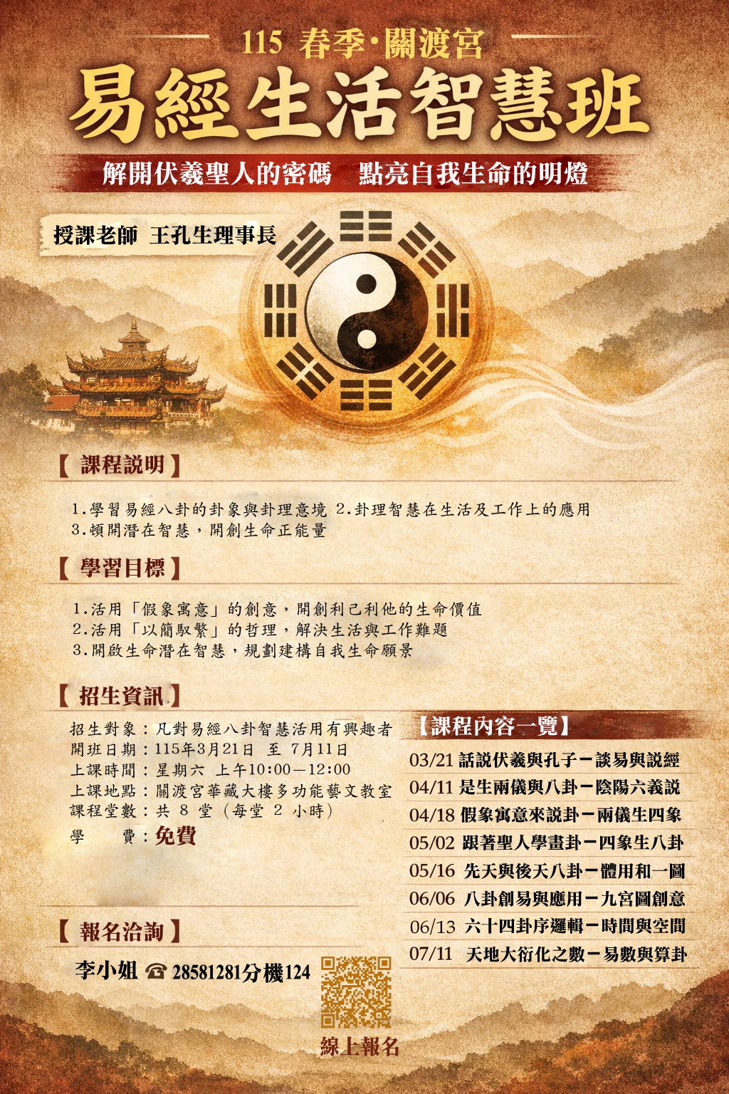 以貼近日常生活的方式,引導學員認識《易經》所蘊含的智慧與人生哲理。課程不以艱深理論為主,而是透過簡單易懂的說明與實際生活案例,幫助學員理解陰陽平衡、進退取捨與順勢而行的智慧。期望藉由本課程,讓學員在學習中安定身心,在生活中實踐智慧,打造溫暖、和諧且充滿正能量的社區學習環境。