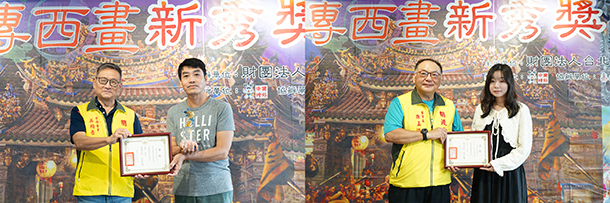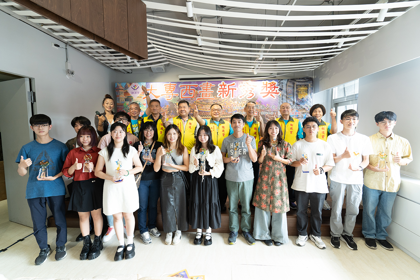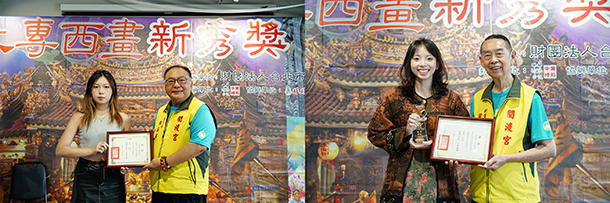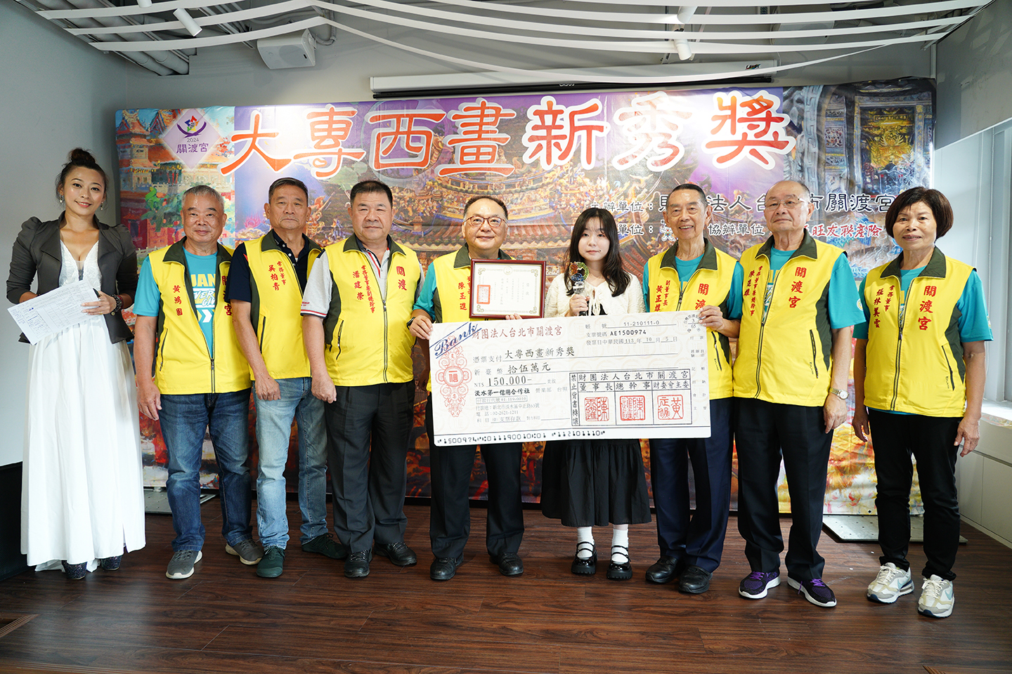 今年關渡宮大專西畫新秀獎以「廟會、廟繪」為主題, 並以「哨角聲響起」作品拿得頭籌,榮獲今年新秀獎,