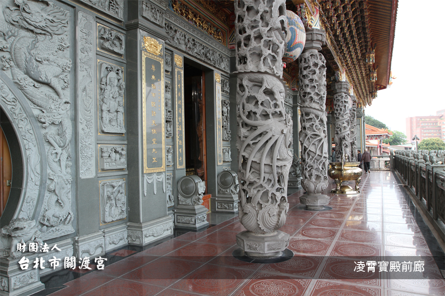 整座凌霄寶殿立面牆布滿著各種石雕作品,來到寶殿居高處,不能錯過精彩的石雕龍柱與石造欄杆之美,欄板上雕作各種吉祥紋樣,望柱邊上雕有四季花瓶,象徵四季平安,這樣的裝飾延續至逐一而上的靈山公園。站在廊道上仰望天花,各種不同形式的藻井與紋飾,堪稱關渡宮之最;有立方形、六角形、圓形、橢圓形等。寶殿後外檐牆以石雕、泥塑彩繪作為裝飾,一大幅的泥塑彩繪「福祿壽」,堪稱整個關渡宮建築最美的後門面之句點。