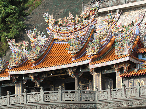 千手千眼觀世音殿也就是古佛洞的終點,主祀千手千眼觀世音菩薩,殿宇正好位在濱臨淡水河峭壁的半山腰上,是由山壁往外延伸興建,並以屋脊上的剪黏、屋簷下的花籃,傳統寺廟的莊嚴一一具足。至於廟埕廣場是以半圓弧的造形,懸空在峭壁上,站在廟埕的石造欄杆,可以回望屋脊上的鰲魚吐草剪黏、屋簷下的花籃,以及右邊邊坡建築物山牆上的泥塑神像「東華帝君」,甚至還可以遠眺對面的觀音山、關渡大橋,是進入關渡宮尋幽訪勝,最美好的中繼休憩站。