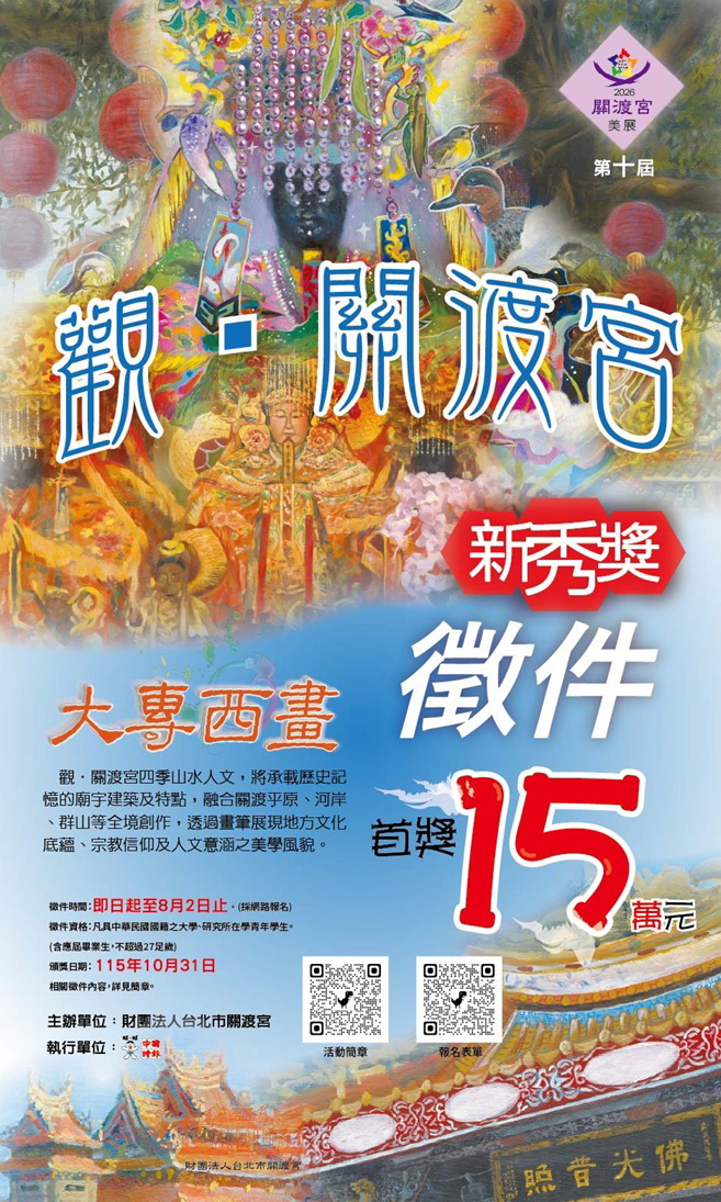 畫,關渡宮於關渡地區自古至今的歲月風華,透過畫筆展現地方文化底蘊、宗教信仰及人文意涵之美學風貌。並承載歷史記憶的廟宇建築及特點,融合關渡平原、淡水河岸、大屯山及觀音山等全境創作。鼓勵青年深入鄉土,擴大創作視野。
