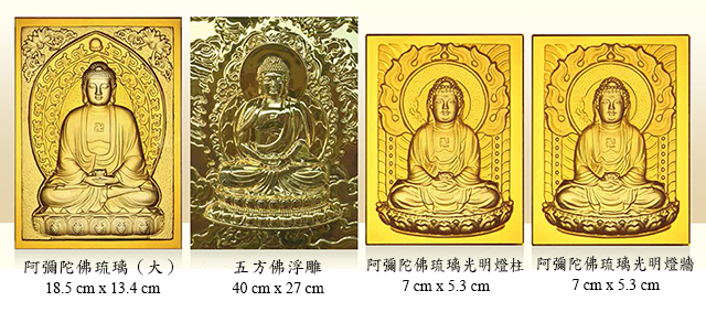 左右兩側有韋陀、伽藍二護法菩薩,入口處並有彌勒佛。五方佛之背牆,設計為琉璃阿彌陀佛,佛前六柱亦設計為八面琉璃阿彌陀佛柱,前方柱身並有四大天王、十二圓覺菩薩和飛天伎樂供養,樑上並安放安金浮雕五方佛。