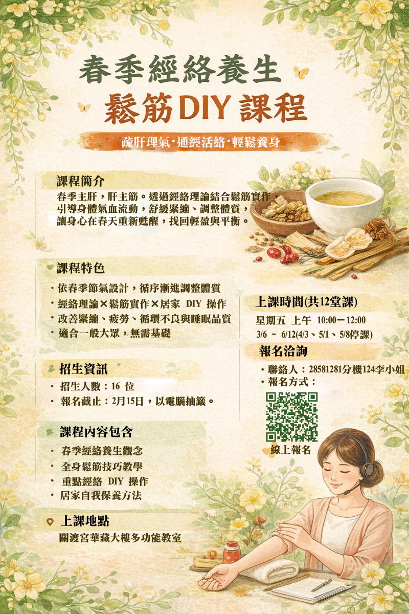 依循傳統中醫經絡理論與四時養生觀,結合現代健康促進理念,透過溫和、安全且具實證基礎之撥筋與經絡調理方法,協助學員調整體質、舒緩壓力,進而提升整體身心健康。培養學員正確養生觀念,建立長期自我照護能力。